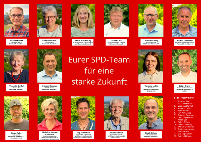 Die Aufstellung der Kandidaten für die Kommunalwahl am 14.September war Hauptthema der letzten Mitgliederversammlung der Medebacher Sozialdemokraten. Für die einzelnen Wahlbezirke wurden Michael Hiemer, Eva Papenheim, Astrid Just-Herzig, Thomas Just, Manfred Liebig, Werner Dornhöfer, Veronika Denhof, Andreas Rosenau, Vanessa Liebig, Björn Brune, Stefan Rabe, Tina Hiemer-Krallmann, Roy Nimscholz und Reinhold Emde nominiert.